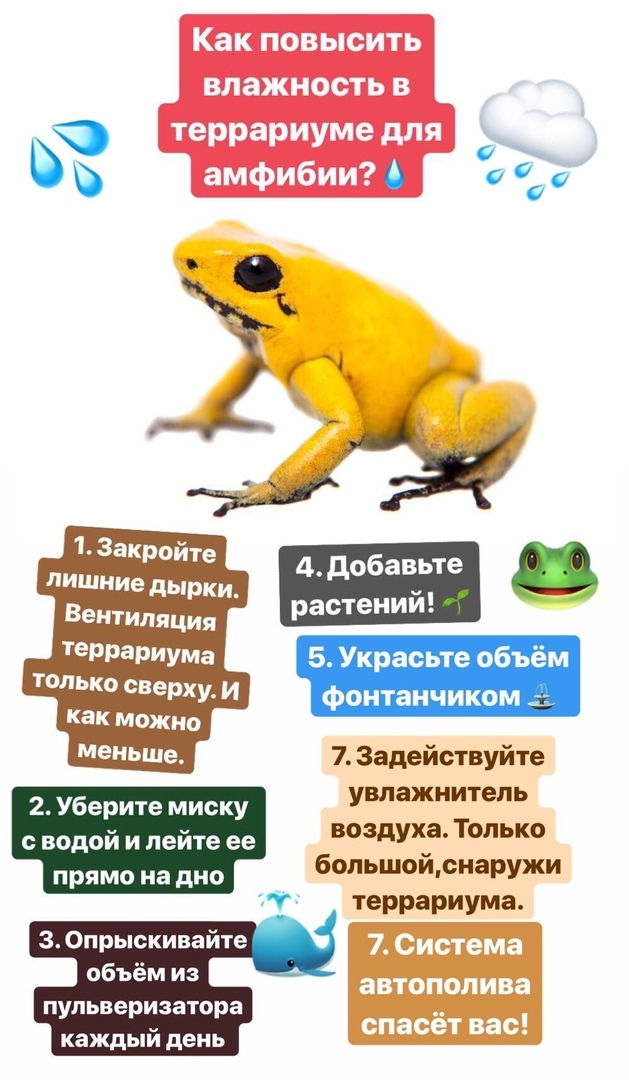 Большинству амфибий действительно нужна влажность не менее 80, а лучше и все 100% (но не всем 🙂 есть и более сухие виды).
